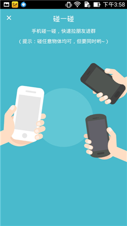 3)四种邀请方式中,“邀请好友”“邀请QQ好友”“邀请微信好友”都是只需要找到好友然后点选确认邀请就可以完成。第四种方法“碰一碰”也是比较有特色的一种邀请方式,方法是双方打开该然后同时碰一下,或者同时碰任意物品,雷达可以搜索到,然后就可以邀请了。(如下图)