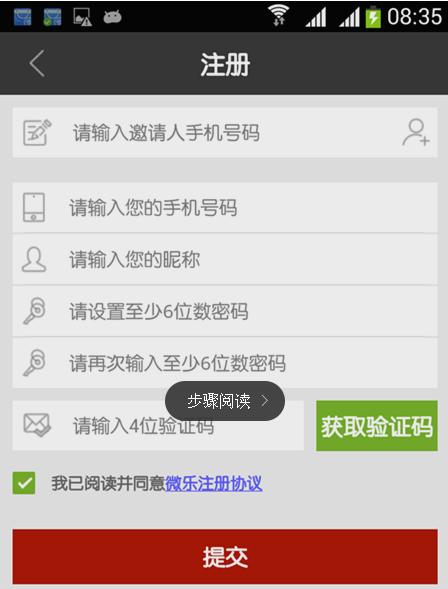 第二步:点击注册以后,打开的界面是这样的;然后请在第一栏填写邀请码: 18220782810 然后在第二栏填入你的手机号码(注意:手机号码不能乱填的,因为手机号码就是你注册的账号,在下面的步骤中还要接收验证码),第三栏填入你的昵称,第四栏填入你的密码,第五栏填写你刚才在第四栏填写的密码!然后点击获取验证码,系统会发一个短信到你的手机上,你把短信里面的验证码填写到这里,然后点击提交。