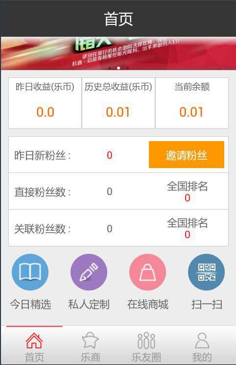 自己看一个广告可获得5点经验和0.005乐币(1乐币=1元),你的粉丝看一条广告,你可以获得0.003乐币。