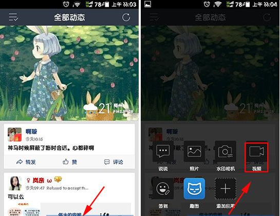 1、首先在QQ空间的“+”点击进去,然后点击在“视频”中点击进去。