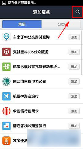 2)在“服务”的“添加”中点击进去,然后在右上角的搜索的图标点击一下。(如下图所示)