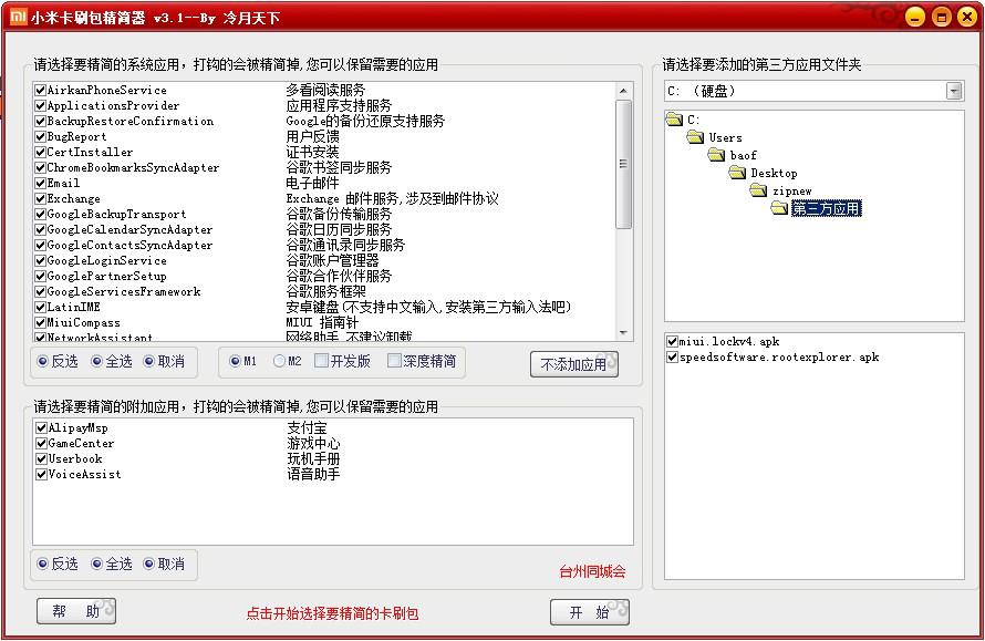 你可以去掉一些不需要增加的应用(去掉前面的勾选)所有选择都确定后,点击开始,选择你要精简的卡刷包文件,如下图: