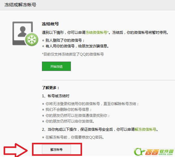 如上图,点击“解冻账号”后,需要登录QQ,然后按照提示完成微信账号解冻即可。