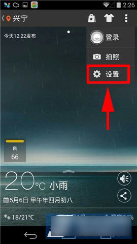 1)首先打开墨迹天气(点击下载),点击右上角按钮,在弹出菜单选择“设置”。(如下图)
