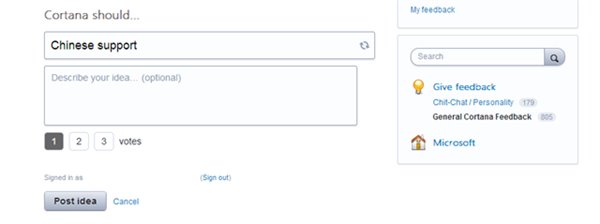 微软为Cortana设立了个性(调戏)和常规反馈两个方面的类别,短短几天已经有许多反馈建议。