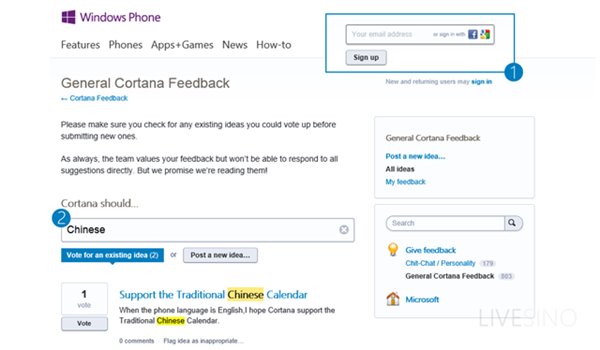 • 进入Cortana UserVoice站点后,点击下方的反馈论坛:Chit-Chat / Personality或General Feedback。