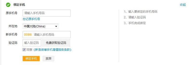 1. 更改绑定手机只需点击微博首页 "帐号“进入帐号设置页面,点击页面左侧的“帐号安全”并点击“绑定手机”展开选项;