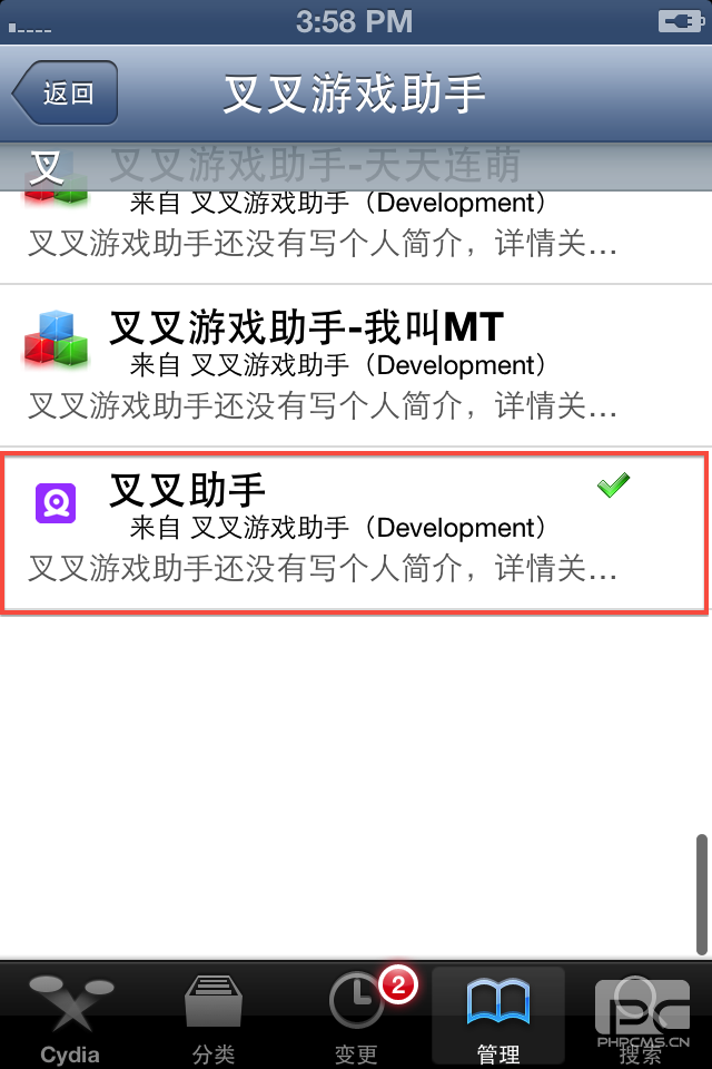 第二种方式:下载叉叉助手ios越狱安装包(.deb)格式,下载完成之后用iFunbox或者iFile等pc端程序,将其拖到越狱手机的/var/root/Media/Cydia/AutoInstall目录下,重启手机即可自动安装。