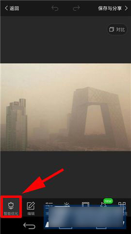 2)打开图片后,点击左下角的【智能优化】,然后把下排选单拉到最右找到选择【去雾】,就可以看到效果了,然后点击右上方【√】保存。(如下图)