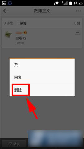 3)在弹出窗口选择【删除】,然后选择【确定】,这样就可以删除手机微博的评论了。(如下图)