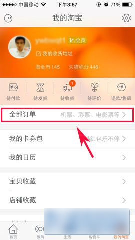 1)首先,点击【我的淘宝】(点击下载),然后选择【全部订单】。(如下图所示)