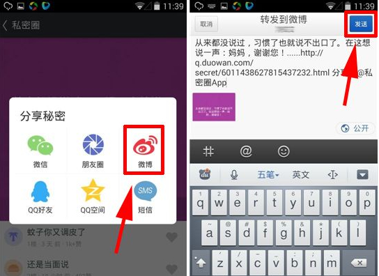 2、然后选择你所要分享去的地方(这里以微博举例),系统会自动为你编写分享内容,然后按【发送】,微博的朋友就能看到你所分享的这条秘密了。