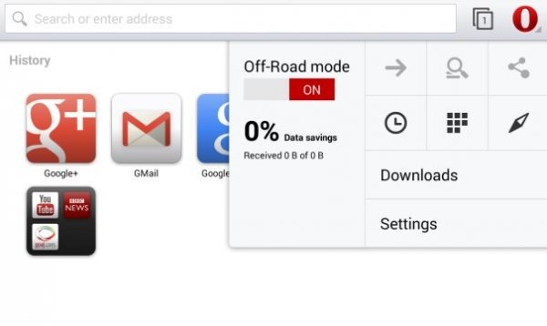 打开Opera的越野模式(Off-Road)的方法就更简单了,打开O菜单,就可以看到Off-Road的选项,你可以直接选择打开或者关闭。这样的设计可以让你方便选择不同的上网模式,例如说当你用WiFi上网时可以把Off-Road关闭,而用手机运营商网络时可以打开Off-Road。此外在Opera中你还可以设定在Off-Road模式中图片的压缩比例,选择更高的压缩比例可以给你节省更多的流量,不过图片的质量自然就会随之而下降啦。