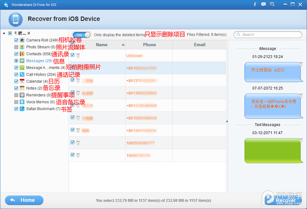 温馨提示:只要你删除资料还保留在iOS设备文件没有被新数据覆盖(即是恢复/升级固件或其它方法)一般都可以使用【Wondershare Dr.Fone for iOS】工具找回来。