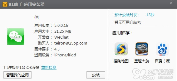 安装PC端91助手(安装时若提示关联ipa文件,请选择确定同意),下载微信5.0共存版wechat.ipa,双击wechat.ipa安装包,出现如下图弹窗,点击【安装】