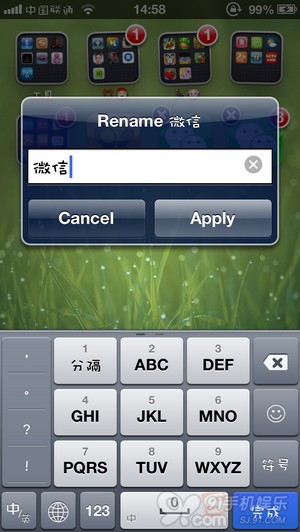 进入主屏幕,长按某个App图标,直到所有App图标抖动起来,然后双击(或连击)你要更改名称的App图标即可。如下图所示,出现修改弹窗,将新名称输入进去,点击【Apply】即可