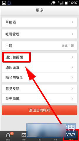 1)打开手机微博(点击下载),点击右下角【更多】,选择【通知与提醒】。(如下图)