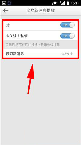 2)在【通知与提醒】页面选择【底栏新消息提醒】,在里面就可以选择打开需要提醒的类型和自动获取新消息的时间。(如下图)