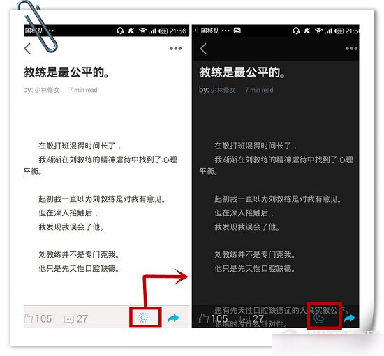 打开其中的一篇文章后,我们可以看到屏幕下方的几个小标志,分别是“赞一个”“评论“‘小太阳”“小箭头”,点击小太阳就可以切换夜间模式了,晚上阅读时也不会刺伤眼睛。