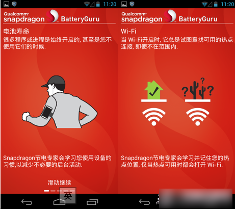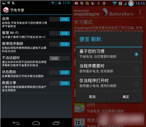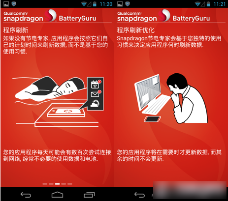这款节电应用全名是Qualcomm Snapdragon BatteryGuruBeta。这是专为Snapdragon处理器编写的省电应用,可以延长和优化Snapdragon处理器的电池续航,防止在wifi区外反复扫描、频繁地同步检查、夜间睡眠期间接受短信电话等。