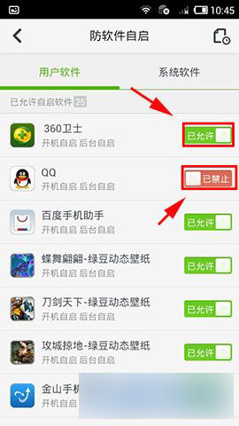 3)在超强模式中,我们可以看到“防软件自启”这一选项,点击进去,然后在自启软件的右边选择“已允许”,禁止自启的软件中选择“已禁止”就可以了。(如下图所示)