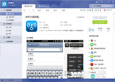 方法二:在类似于pp助手的苹果软件管理的工具中,在越狱应用中搜索“WiFi万能钥匙”顶级下载