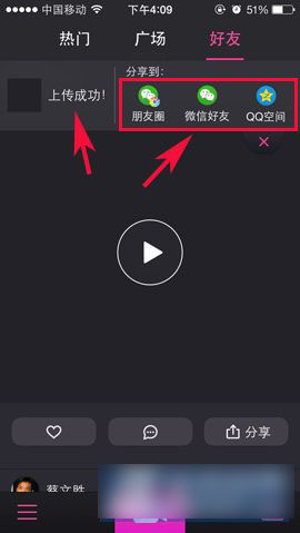 其实大家需要将美拍作品分享到微信朋友圈跟微信好友或者QQ空间的话,只要等你把视频上传成功后猜能看到分享按钮的。(如下图所示)