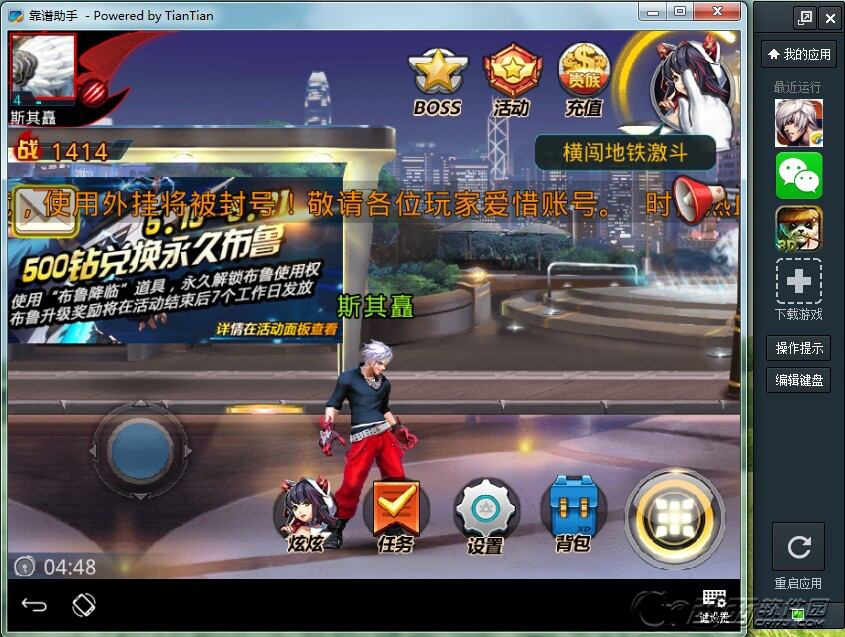 这里我要着重讲下,我为什么推荐大家在电脑上玩《天天炫斗》,其一自然是格斗类游戏嘛,大屏王道,最近换的HTC的2K屏幕,玩起来那就一爽! 其二就必须是操作了。在游戏的中后期,副本相对难度和技巧会高很多,所以对于我们的操作而言也极其重要。手机介于屏幕大小薄厚等差异,操作起来难免失误。特别是BOSS的必杀,你一个激动手遮住了技能范围,那死的就不是一般的惨了。所以作为万能的游戏神器(键盘/鼠标)操作无论精准度和速度都会上一个台阶。