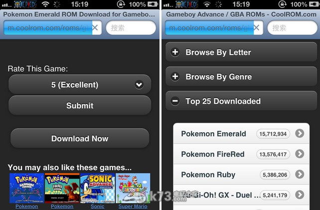 其实下载GBA的游戏我们可以直接在GBA4iOS上下载,很方便,在打开GBA4iOS之后,有上角有个搜索的logo,点击一下,会自动弹出Safari的Google搜索结果,以第一个搜索结果为例,选择进入,里面直接提供了热门游戏的排名,选择任意游戏,进入详情查看,一直翻到下面的“Download Now”开始下载,停留在页面知道下载成功,弹出压缩文件的打开凡是选框,选择使用“GBA4iOS”打开。