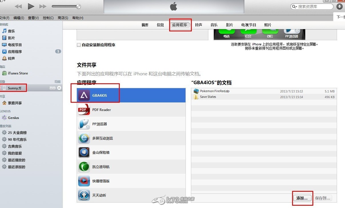 这是一种直接用手机下载的方法,如果你的电脑上刚好有GBA的rom,你不想在手机上重新下载的话你可以把手机连接电脑,直接使用itunes的共享功能把rom添加到GBA4iOS,方法其实也是相当的简单。