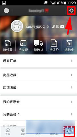 1)打开手机天猫,点击右下角【我】,选择右上角【设置】。(如下图)