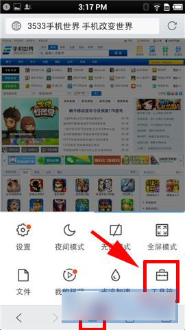 1)打开手机QQ浏览器,进入需要查找内容的网页,然后点击下方【三】,在弹出选项想左滑动,找到并点击【工具箱】。(如下图)