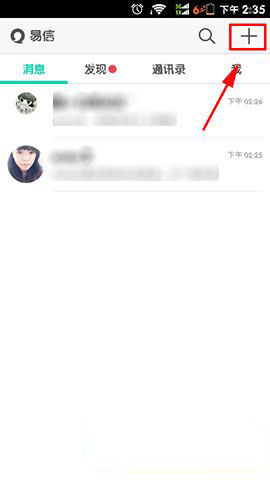 1)首先先要进去易信群的页面就是在右上角的“+”中点击进去,然后在“发起群聊”中点击一下。(如下图所示)