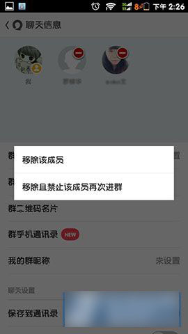 4)在需要移除的成员中点击一下,然后系统会弹出“移除该成员”、跟“移除且禁止该成员再次进群”,选择其中的一项就可以成功的移除群内的成员了。(如下图所示)