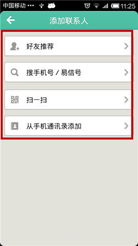 2)点击添加好友按键,添加联系人中出现好友推荐、搜手机号/易信号、扫一扫、从手机通讯录添加。