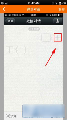 2)然后进入“发布”之后,我们可以看到“微信对话”、“朋友圈”、“信息”、“微博”,选择其中一项,以“微信对话”为例,点击进去。然后在“+”点击一下选择人物。(如下图所示)