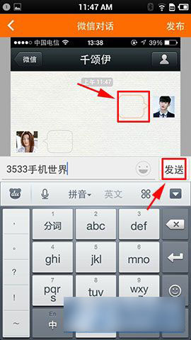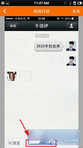 3)选择好人物之后,然后在对话框点击一下,就可以输入文字内容了,点击发送就可以了,最后制作完成之后,点击“保存到相册”就可以把制作的对话保存好了(如下图所示)