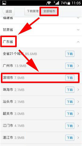 2)点击【全部城市】,选择要下载的地图,点击【下载】,下载完成后可在【下载管理】处查看。(如下图)
