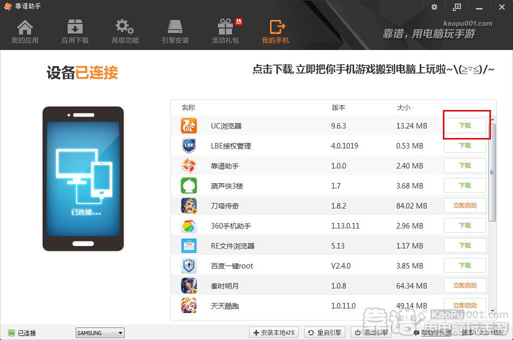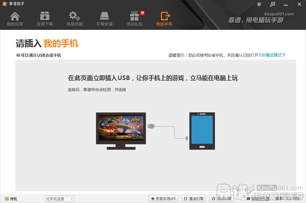 靠谱助手2.2新增加了【我的手机】功能,可以让你手机里的应用,立马能在电脑上玩。今天来教新手如何使用吧!
