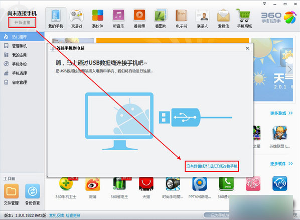 2.点击“连接手机”—“没有数据线?试试无线连接手机”