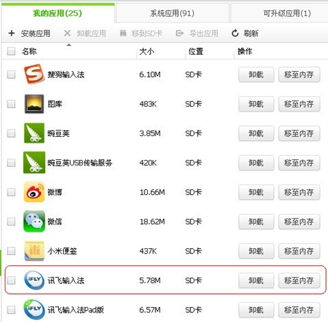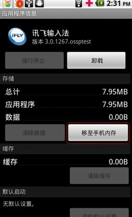 1、手机“系统设置“->”应用程序“->”管理应用程序”->”讯飞输入法”界面,点击”移至手机内存“,可以解决此问题,如图所示: