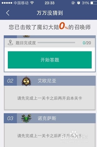 点击万万没猜到之后,有3个关卡分别是德玛西亚;艾欧尼亚;诺克萨斯,需要先通过前面的关卡才可以完成后面的。而且每个关卡的题目也不同,例如德玛西亚只有20道题目,而后面的诺克萨斯有足足50道~好大的挑战!