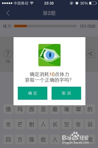 如果你一时答不出来的话,可以用体力来获取游戏提示,每10点体力就可以获得一个正确的字,所以要好好利用哦,不到万不得已还是不要用道具了,毕竟体力可是很难积少成多的啊~