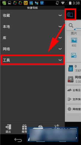 1)打开ES文件浏览器(点击下载),点击【左上角按钮】,在弹出菜单选择【工具】。(如下图)