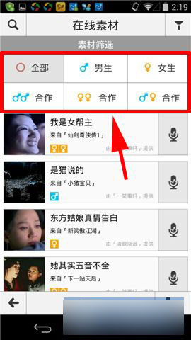 2)在素材选择页面,点击右上角【Y字形按键】,在弹出菜单就可以进行素材筛选,【♂】代表男,【♀】代表女。(如下图)