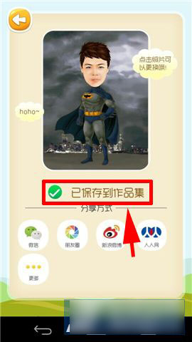 5)回到设计页面,彩漫人物就设计好了,点击右上方,可以把该形象保存到作品集。(如下图)