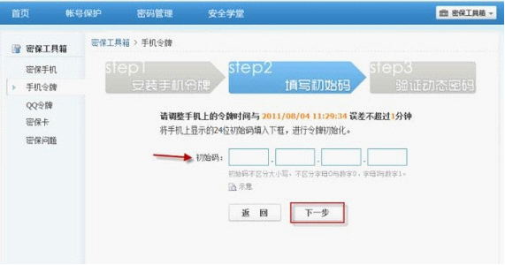 输入QQ安全中心(手机令牌)上提示的24位初始码到网页提示位置,并点击【下一步】。输入网页返回的4位校验码到手机,并点击【校准时间】。