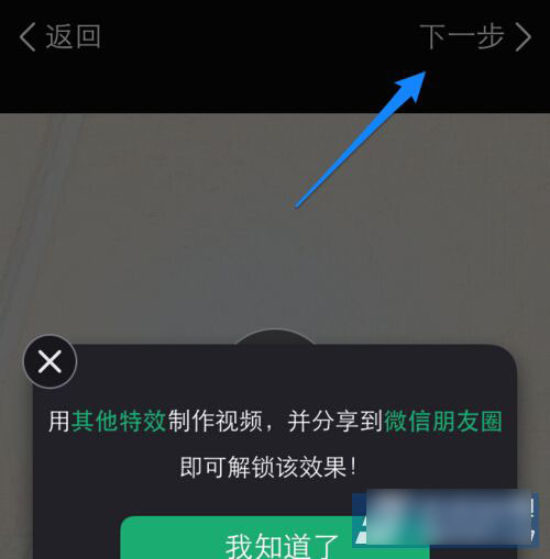 3)当我们点击“下一步”按钮时,会得到这样的提示,让我们用其它已经解锁的特效制作并上传视频,最后分享到微信朋友圈即可解锁。