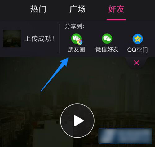 4)我们按照它的要求,用其它没有锁定的特效制作并上传视频。当视频上传成功以后,点击分享到下方的“朋友圈”图标,如图所示