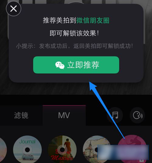 1)倒数第二个特效解锁成功以后,接下来再解锁最后一个特效。用同样的方法,得到解锁最后一个美拍的解锁方法。当我们选择最后一个特效来制作视频时,它会告诉们需要推荐美拍应用到微信朋友圈才可以。